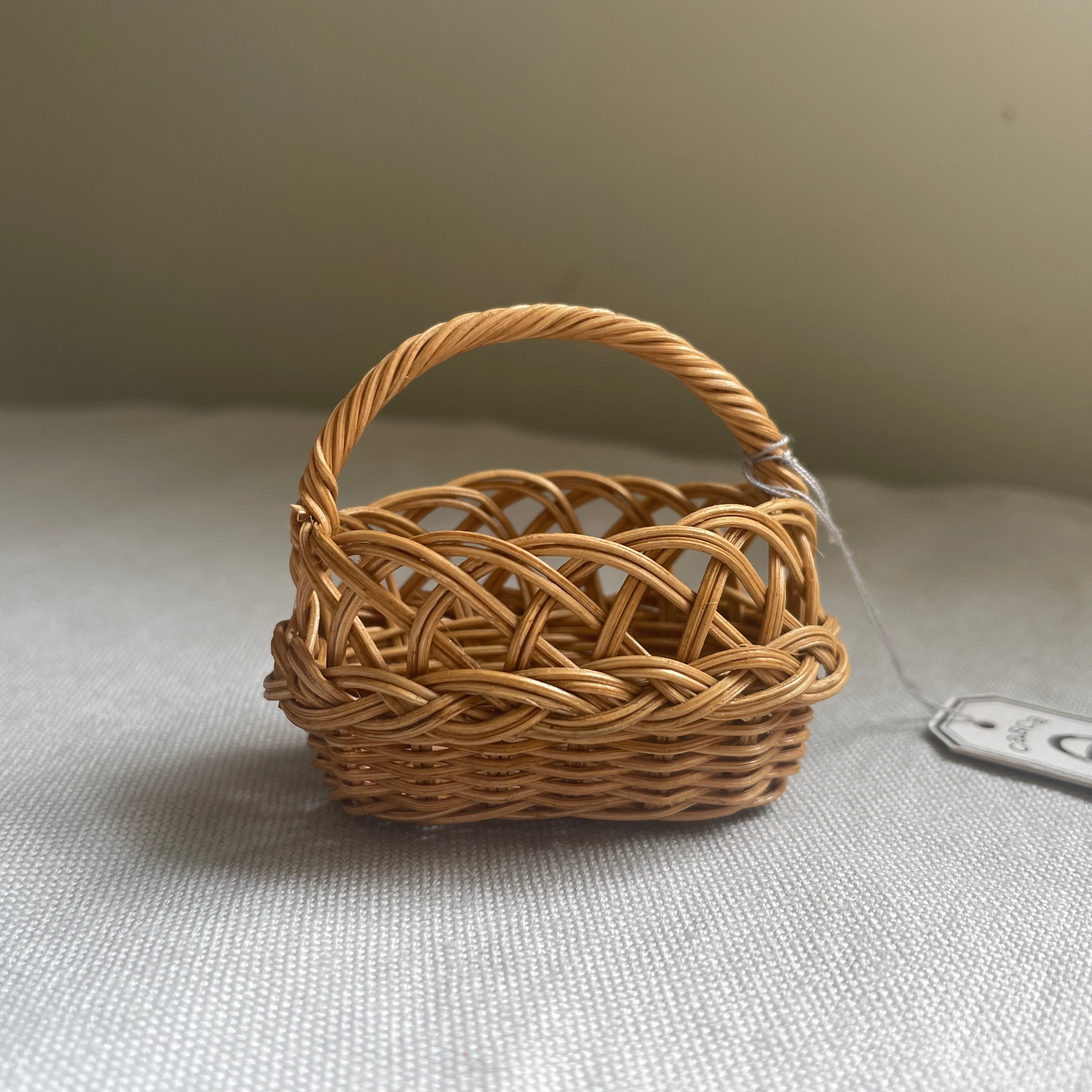 天然の細い籐を使用して編み上げた、ミニチュアサイズのかごです。
